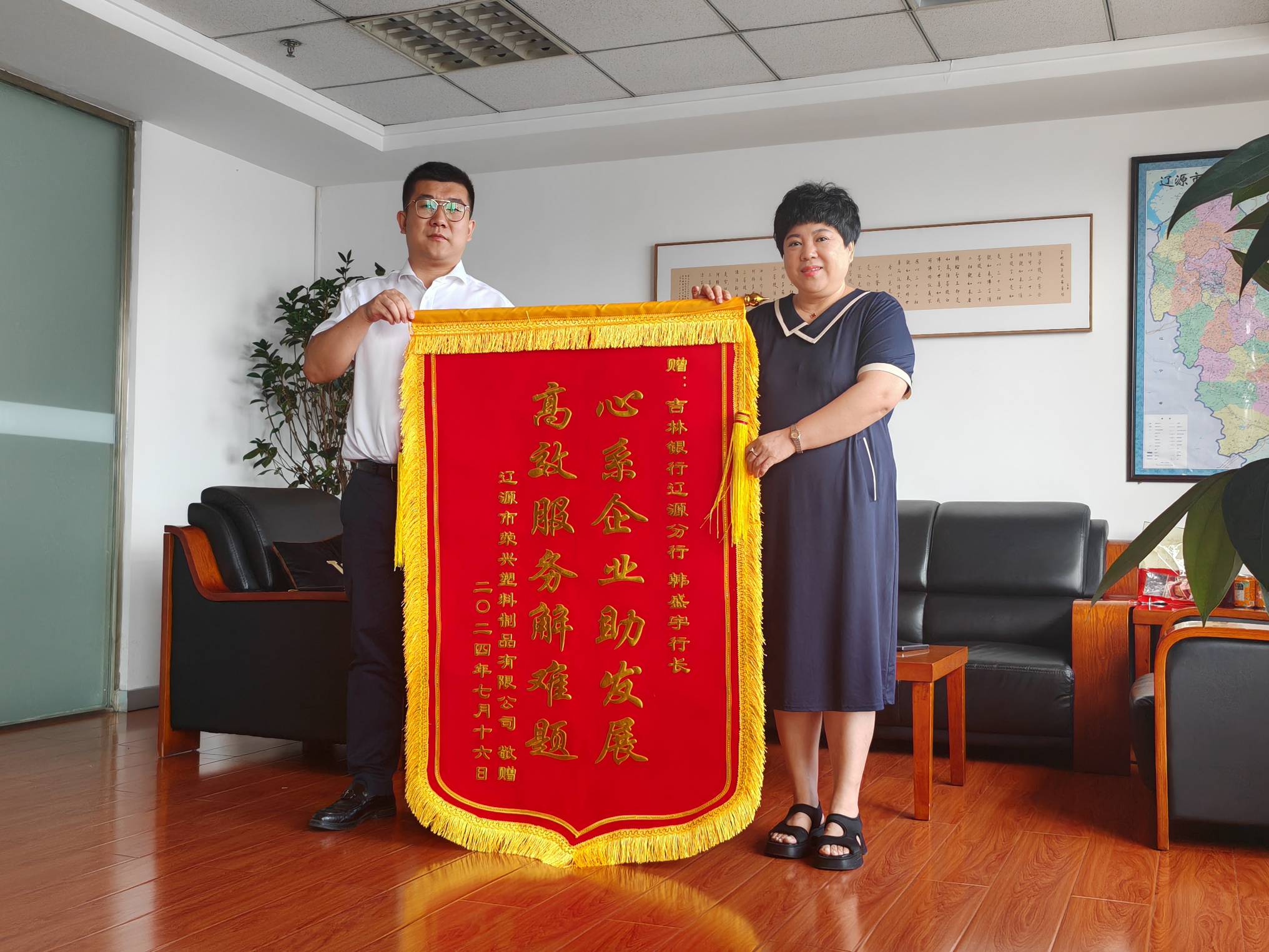 7月16日,辽源市荣兴塑料制品有限公司总经理齐宝荣一行来到吉林银行辽源分行,将一面写着“心系企业助发展 高效服务解难题”的锦旗送到分行,以感谢辽源分行党委委员、副行长韩盛宇带领的公金团队为其提供的高效、专业服务。