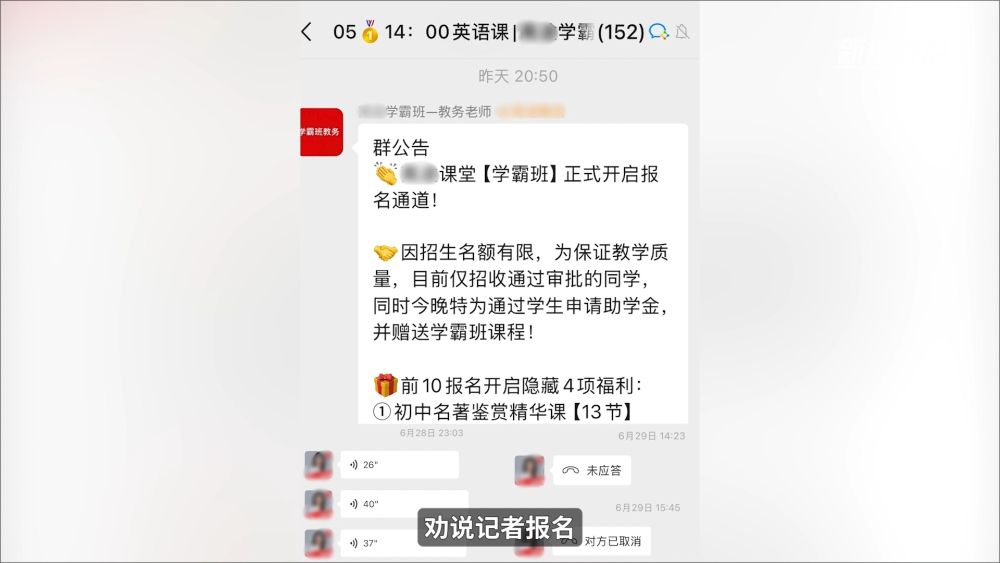 经过几天交流,助教老师开始推介其所在培训机构重点打造的“清北学霸班”,称其为“市面上能接触到最好的教育资源”,随后将记者拉入报名群中,并持续通过语音电话、留言等方式劝说记者报名。